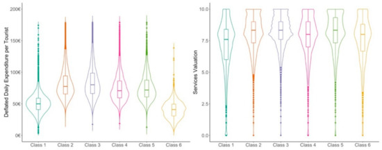 - For average and high daily expenditure, very similar results are found. In particular, travelers who give a low valuation have a high probability (0.4–0.6) of belonging to class 1. As their valuation increases, they tend more and more (up to 0.3–0.4) to belong to classes 2 or 3. There is also a non-negligible probability of belonging to class 4, especially at intermediate valuations.