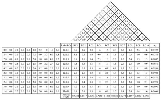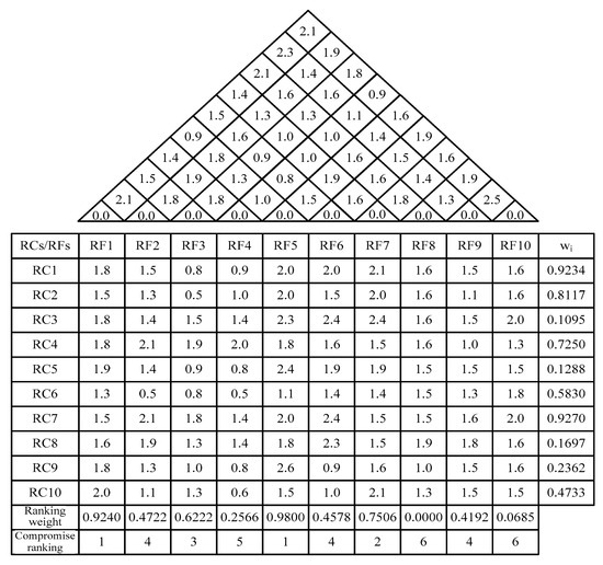 This study applied the VIKOR method to calculate the ranking weights for the RCs required by the case study company to mitigate its supply chain risks. As past research has found that risks are interdependent, an integrated relational matrix was constructed that considered the correlation, relational matrix, and interdependent matrices. In this study, Equation (1) in Section 3 was used to multiply the three matrices; the resulting integrated relational matrix is presented in Table 8.