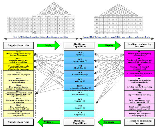 As the present study deployed RCs to mitigate supply chain risk, the supply chain experts were asked to assess the ability of each RC to mitigate risk on the same four-point rating scale. The resulting relational matrix in Table 7 was included in Step ③ of the first HoQ (Figure 2).