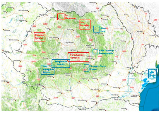 In 2012, the Ministry of Regional Development and Tourism of Romania, in partnerships with the National Institute for Research and Development in Tourism (INCDT) and the Association of Ecotourism in Romania (AER), developed the framework for evaluating and certifying ecotourism destinations in Romania [16]. This initiative is based on the recommendation of the World Tourism Organization to use the European Ecotourism Labelling Standards (EETLS) [49], developed and refined in the frame of several EU funded projects as part of the [50]. By adopting this framework, destinations that meet the criteria are awarded with the title of “ecotourism destinations”, and they will be included in the national tourism promotion campaigns, targeting the domestic and foreign markets [46]. There are ten ecotourism destinations developed and promoted by AER in Romania. The present study focuses on four of them that were selected because they can ensure accurate data collection. As they are located in different geographical areas of the country (see Figure 1), they were considered appropriate for the purpose of this research. The ecotourism destinations included in the research are presented in red, as follows.