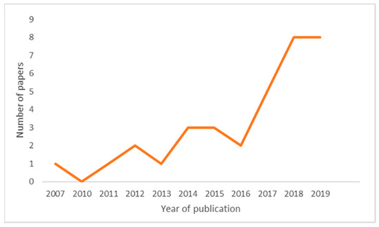 The most important criterion of descriptive analysis is to examine the sample of literature based on its distribution over time and across various journals (Seuring and Gold 2012). A descriptive analysis was conducted which shows that the publication frequency was distributed between 2007 and 2020; 2007 (n = 1), 2011 (n = 1), 2012 (n = 2), 2013 (n = 1), 2014 (n = 3), 2015 (n = 3), 2016 (n = 2), 2017 (n = 5), 2018 (n = 8), 2019 (n = 8) and 2020 (n = 1). As is shown in Figure 1, an increasing trend over the past decade is evident, particularly since 2013, of a steady rise in interest of the research areas. As the 2020 data are from an incomplete year, these results are excluded from Figure 1.