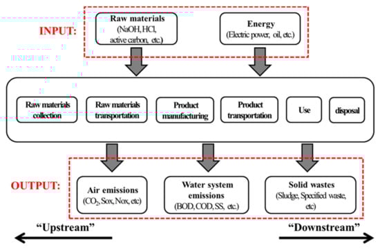 Raw materials, energy, and utilities are inputs, and air emissions, water system emissions, solid wastes, etc. in the manufacturing process, the use process, and the disposal process are outputs. Early stages of the construction process such as collection and transportation of raw materials are referred to as “upstream,” whereas product use and disposal are “downstream.”