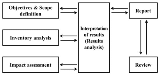 General guidelines to LCA structures and procedures used to assess environmental performance in a series of processes can be found in ISO standards 14040 and 14044, international standards for environmental management (green management) established by the International Organization for Standardization (ISO) [1,2]. As shown in Figure 2, the LCA consists largely of objectives and scope definitions, inventory analysis (LCI), impact assessment (LCA), and interpretation of results.