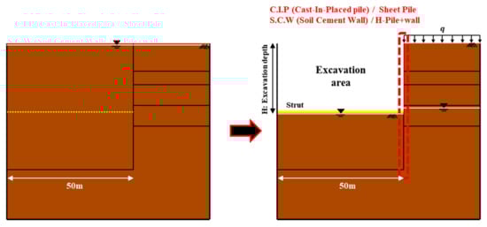 Figure 3 shows a schematic diagram of the numerical analysis carried out in this study. The underground water level is reflected in the analysis on the premise that it is lowered according to the stage of excavation and lowered to the excavation surface. The review of stability, such as the stability of the embedded unit, the stability of subsidence, and heaving in each case, considered only the impact on excavation depth because it was affected by the increase in stress depending on excavation depth and was independent of the excavation width.