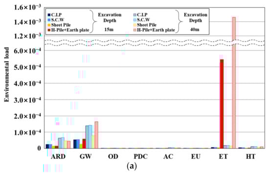 First, in the composite soil condition of shallow excavation (as shown in Table 6), the environmental load of the H-Pile+Earth Plate construction method was the highest, at 6.26 × 10−4, which shows that the impact of the environmental load was great due to the use of wood. Next, the environmental loads were high in the S.C.W, C.I.P, and Sheet Pile construction methods, in that order. In the environmental impact factor, the H-Pile+Earth Plate construction method showed the highest ecological toxicity, and the other three construction methods (C.I.P, S.C.W, and Sheet Pile) showed the highest environmental load in the order of global warming and resource depletion. In the composite soil condition of deep excavation, (as shown in Table 7), the environmental load of the H-Pile+Earth Plate construction method for the earth-retaining wall was 1.68 × 10−3 (the highest), and the environmental load of the other construction methods was high in the following order: S.C.W, C.I.P and Sheet Pile. Considering the environmental impact factor, the H-Pile+Earth Plate construction method had the largest environmental load for ecotoxicity, and the environmental load of the other three construction methods was high in the order of global warming and resource depletion.