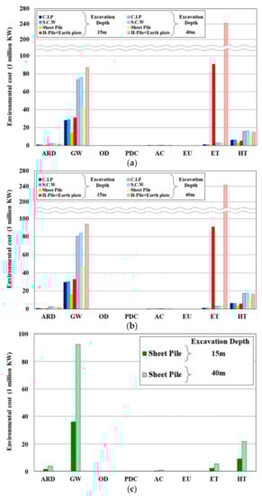 Table 8 and Table 9 and Figure 5 show the results of identifying and evaluating major environmental impacts through list analysis and impact assessment results following the purpose and scope for cases where the excavation area is of medium scale (50 × 50 m) in shallow excavation (15 m) and deep excavation (40 m) depending on the ground conditions. On this basis, in order to evaluate the environmental and economic impacts of the earth-retaining wall, evaluation of environmental economic feasibility was conducted by applying the environmental cost per unit of pollutants based on the environmental impact factor to the characteristics results of the environmental load amount for the eight categories previously calculated.
