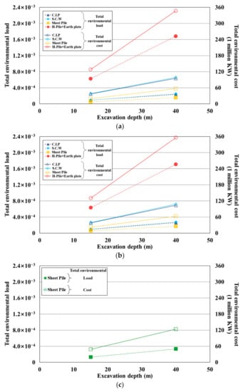 Relationship between total environmental load and total environmental cost by excavation depth and soil condition: (a) composite soil; (b) sandy soil; (c) soft clay soil.
