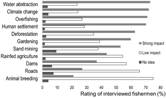 Vulnerability: Changes in fisheries are also driven by poverty and unemployment, as suggested by the interviewees. The majority of youth lack steady employment in rural areas; hence, they seasonally engage in fishing. This increases not only the number of fishermen but also illegal fishing practices, e.g., capture of fry, mass catches of fish, poisoning, and fishing without fishing license.