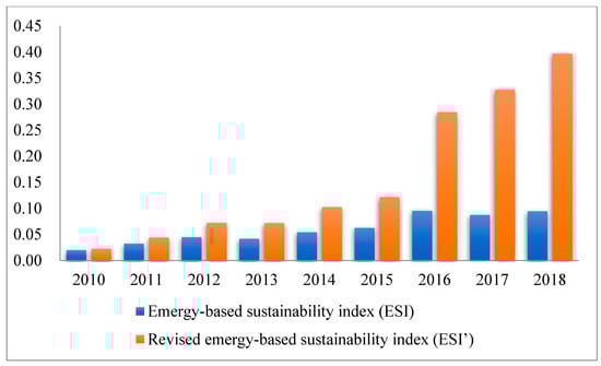 | Revised emergy-based sustainability index (ESI’) | 2.24 × 10−2 | 4.38 × 10−2 | 7.22 × 10−2 | 7.18 × 10−2 | 1.03 × 10−1 | 1.22 × 10−1 | 2.85 × 10−1 | 3.28 × 10−1 | 3.97 × 10−1 |