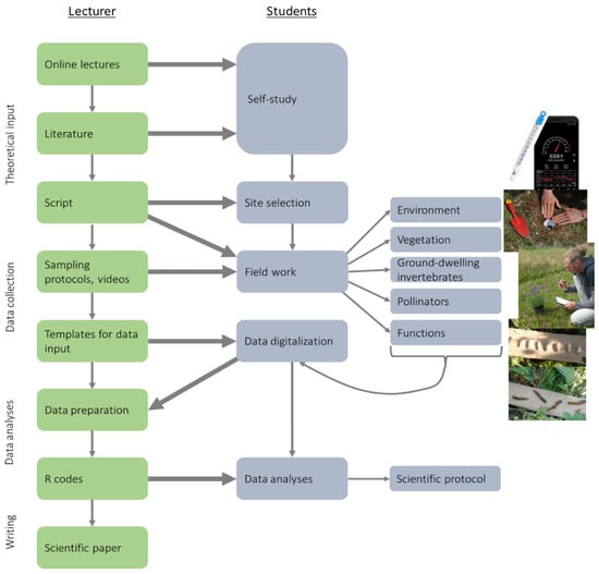 Online teaching offers great opportunities and has multiple advantages for both lecturers and students. It may reduce costs, allow lecturers to teach from various locations, enables students to flexibly access the material at any time and location, and reduce stress by offering self-pacing opportunities for the learners [,]. On the other hand, online teaching often requires more efforts by the teachers and learners, is impersonal by lacking physical interactions between teachers and students and among students, requires a high level of self-discipline, and depends on the IT equipment and resources of both the universities and the students [,,]. Furthermore, online teaching is complicated especially for practical courses, where specific equipment and materials are required (e.g., microscopes or measuring devices in the laboratory). Facing these challenges, our motivation was to develop a teaching strategy for a practical seminar for life-science students (University of Koblenz-Landau, Germany) and to offer the course during the COVID-19 pandemic in the summer semester of 2020. The basic aim of the course “Organisms and their environment” is that students learn practical fieldwork related to current ecological questions. Thus, we combined the online provision of theoretical input by the teachers (lectures, videos, sampling protocols, etc.) with inquiry-based learning by the students (independently conducted practical fieldwork). Most of the students were in the early semesters of their bachelor´s program and had virtually no experience in ecological fieldwork. Moreover, many of them were working from their home residences because of the lockdown of the campus and travel restrictions and, thus, had no access to the university’s scientific measuring equipment. We, therefore, conceived the fieldwork part of the course using a “citizen science” approach (see Section 2.1, Figure 1).
