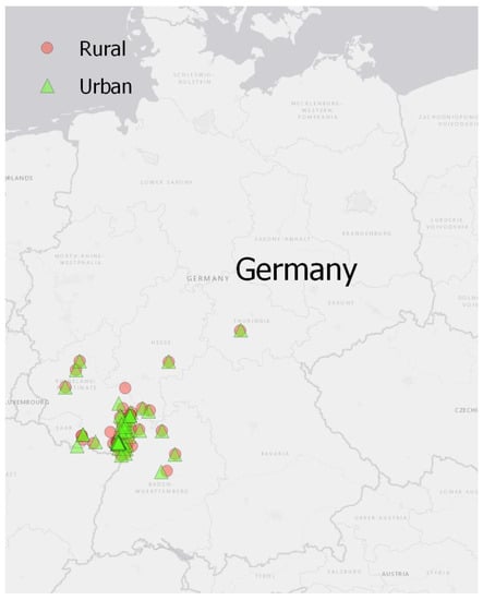 Overview of the observed grassland pairs in urban (green triangles) and rural (red dots) environments. Data collections were conducted by 75 life-science students of the University of Koblenz-Landau.