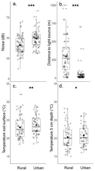 Comparisons of environmental parameters between urban and rural grassland sites. Differences were significant for (a) the background noise level, (b) the distance to the next artificial light source at night, and the temperature (c) on the soil surface and (d) at 5 cm depth. Diamonds show the mean. * p ≤ 0.05, ** p ≤ 0.01, *** p ≤ 0.001.