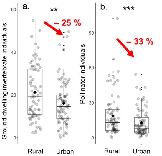 Comparisons of individual numbers of (a) ground-dwelling invertebrates and (b) pollinating insects between urban and rural grassland sites. Diamonds show the mean. ** p ≤ 0.01, *** p ≤ 0.001.
