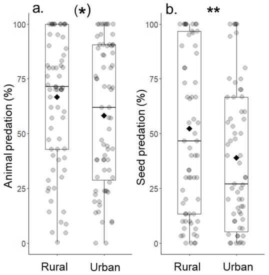 Comparisons of (a) animal predation and (b) seed predation between urban and rural grassland sites. Diamonds show the mean. (*) p ≤ 0.1, ** p ≤ 0.01.