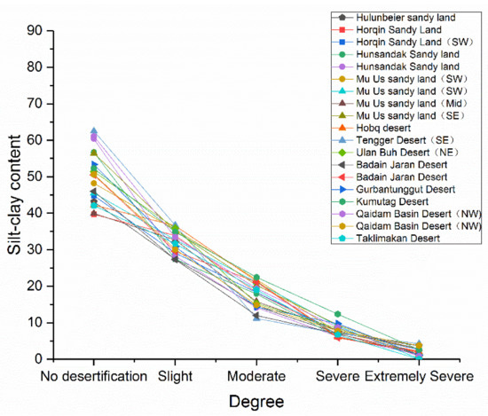 The silt–clay contents of different desertification levels in different areas (Data from reference [19,23,31,32,40,41,42,43,44,45,46,47,48,49,50,51,52,53,74]).