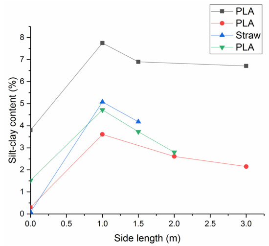 In terms of material types, since sand barriers have a long history of development, there are many types of materials used to make them [77]. According to their sources, they can be divided into natural materials, such as wheat grass, sand willow, and clay, and new artificial materials, such as polylactic acid (PLA) and high-density polyethylene (HDPE). For different sand barrier materials, the evaluation of the barrier materials will be different if the focus of consideration is different (e.g., material cost, source, and durability). We evaluated the effect of different sand barriers from the viewpoint of the variation in silt–clay content collected the relevant data; the results are shown in Table 3.