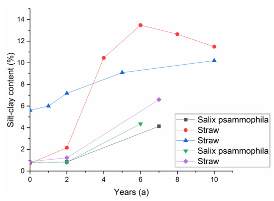 Even for the preferred plant types, there was a mortality rate of approximately half during the growth process [101]. Therefore, the increase in planting time could not be considered as an increase in vegetation cover. Figure 6 shows that the silt–clay content increased to more than 20% in all major desertification areas after several decades of building artificial sand-fixing forest. The silt–clay content of the south-eastern edge of the Tengger Desert increased from 0% to 23.98% after 30 years of building an artificial sand-fixing forest, the powder clay content of the south-eastern edge of the Horqin sands increased from 4.64% to 48.40% in 90 years under the protection of artificial camphor forests, and the powder clay content of the soils in the Mu Us sands increased from 12.40% to 27.19% in 24 years after camphor pine planting. However, it can also be clearly seen in the figure that almost every artificial sand-fixing forest had experienced different degrees of decline in silt–clay content during the development process. On the one hand, it may be due to the decrease of protection effect caused by the death of vegetation, on the other hand, it could be due to the depletion of soil nutrients caused by the growth of plants.