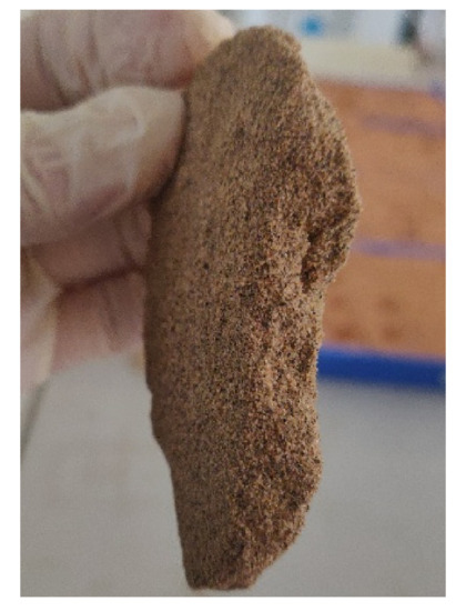 Chemical sand fixation measures refer to mixing or spraying a chemical sand fixing agent into the surface soil of areas affected by wind erosion desertification [78,79]. By its own nature, it can directly or indirectly gel the soil sand particles and then form a consolidation layer [80,81]. As shown in Figure 4, it is the consolidation layer formed after the application of a new sand fixing agent called ADNB(The aqua-dispersing-nano-binder) developed by our team [82]. Thus, the sand fixing agent can fix sand, resist wind erosion, and retain water [83,84,85,86].