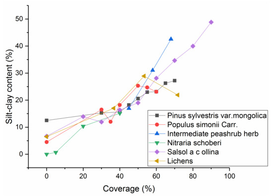 Different coverage of vegetation and silt–clay content (Data from reference [47,63,64,65,66,67]).