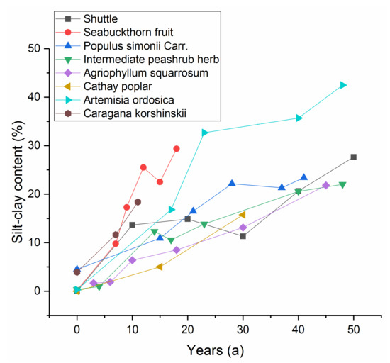 Different years of vegetation and silt–clay content (Data from reference [51,66,68,69,70,71,72,73]).