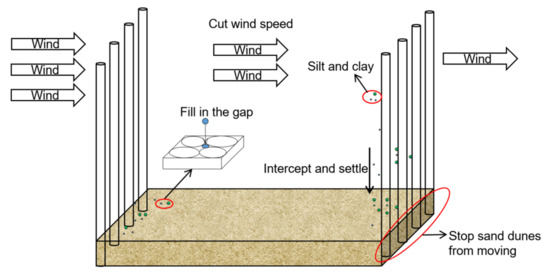 As shown in Figure 8, the sand barrier embedding setting has a strong control capability on flowing dunes and reduces the dune movement rates, gradually transforming them into fixed dunes. Meanwhile, the surface roughness is increased by 400–600 times by changing the sub-bedding surface structure through sand barrier placement. When airflow passes through the sand barrier, it undergoes three main processes: eddy current deceleration, recovery acceleration, and blocking deceleration [116]. These processes enable the sand barrier to ultimately achieve a reduction in near-surface wind speed. Through actual wind–sand flow measurements and numerical simulations, researchers concluded that a 10–20 cm tall sand barrier can reduce the wind speed by 20–40% through two decelerations [58,117]. The sand barrier within this height range not only ensures that the original slit-clay particles within the sand barrier are not blown away but also saves materials to achieve high economic benefits. Under the effect of eddy current deceleration and sand barrier upper interception, silt–clay minerals partly settle and accumulate at the soil surface. Subsequently, under the action of airflow compaction, the silt–clay particles fill the voids in the soil structure, eventually improving the soil structure and significantly reducing the soil capacity. Due to the properties of silt–clay minerals, such as strong soil holding capacity, high porosity, and rich nutrient content, the physicochemical properties of surface soil, such as hardness and nutrient content, are somewhat improved.