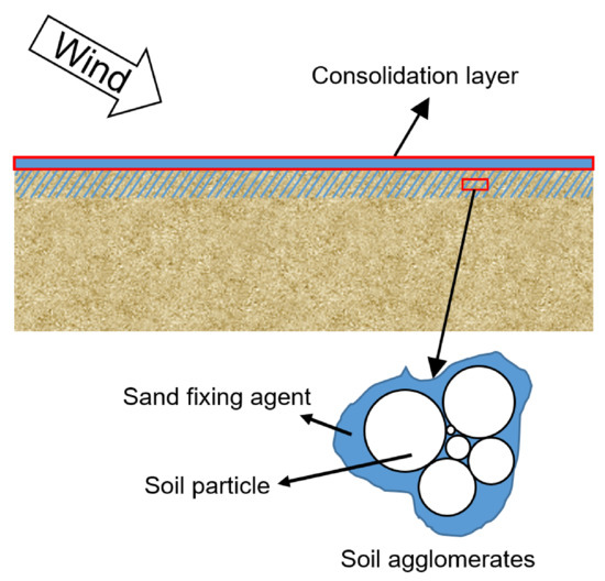 Since there are tiny voids (>8 μm) between particles on the surface of wind–sand soils, sand-fixing agent solutions with adhesive properties produce two main effects when sprayed onto the surface of quicksand [82], as shown in Figure 9. Droplets larger than the interparticle space are retained in the surface layer of sand, forming a layer of solidification with greater strength and not easy to blow after curing. Droplets larger than the interparticle space are retained in the surface layer of sand, forming a solid layer with greater strength that is not easy to blow after curing. Droplets smaller than the interparticle space penetrate into the sand body, forming a more stable and less blowing agglomerate under the influence of adhesion and intermolecular forces. Compared with single sand particles, the formed agglomerates have a larger mass and volume, which can increase the surface roughness and thus increase the starting wind speed; additionally, the agglomerates have the function of keeping the soil particles stable and improving the soil structure [71,120,121].