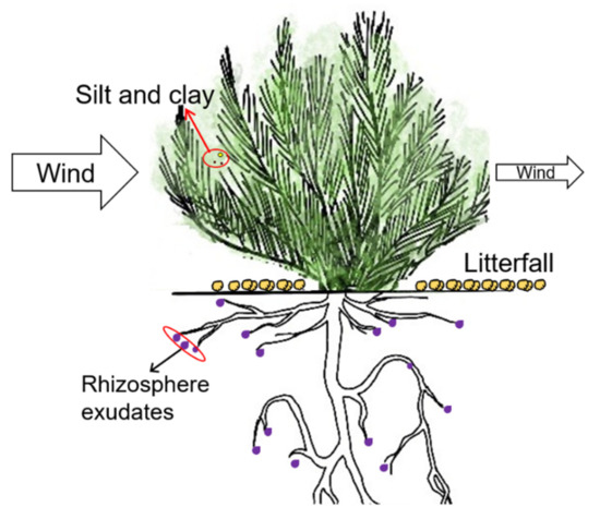 As shown in Figure 10, the accumulation of litterfall in the topsoil cover during vegetation succession has the same protective effect on the soil. The longer the vegetation grows, the higher it grows and the more layers it covers, resulting in a better effect on weakening wind speed. The study on the Horqin sands showed that the weakening of the near-ground wind speed reached 60% when the vegetation cover reached 64%. The dense branches and foliage increased the dust-collecting effect of the plants, intercepting and accumulating the silt–clay particles from the wind–sand flow between plants or on the leeward side, forming a dune-like but immobile landform called nebkhas. Nebkhas can reduce sand abrasion effects on the plant community, thus playing an important role in fixing drifting sand and stabilizing the oasis ecosystem [16,125]. On the one hand, the underground root system of plants can serve as a reinforcement to consolidate the surrounding sand particles [72]. On the other hand, the organic compounds secreted by the rootstocks and the epidermal cells shed by the root crowns can refine the soil particles, promote the weathering of primary minerals and fundamentally increase the source of silt–clay minerals [72,126]. The decay of dead leaves on the surface increases the energy source of the soil microbial community, which contributes to microbial activity, reproduction, and organic matter accumulation, thus promoting the soil-forming action of sand and increasing the production potential [127].