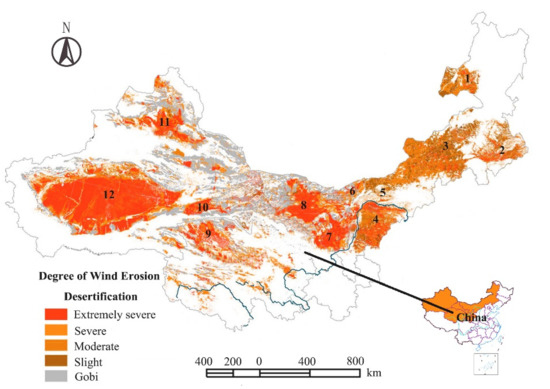Distribution of wind erosion desertification in Northwest China (1. Hulunbuir Sandy land 2. Horqin Sandy land 3. Hunsandak Sandy land 4. Mu Us Sandy land 5. Kubuqi Desert 6. Ulan Buh Desert 7. Tengger Desert 8. Badain Jaran Desert 9. Qaidam Basin Desert 10. Kumutag Desert 11. Gurbantunggut Desert 12.Taklamakan Desert, Data from reference [2,4]).