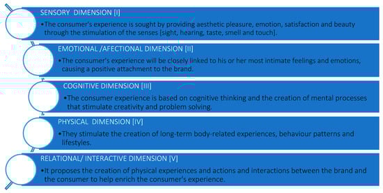 In this work, it is therefore considered that the concept of “brand experience” [121,129,133] is composed of five dimensions: the sensory dimension, the emotional dimension, the cognitive dimension, the physical dimension and, finally, the interactive dimension (Figure 1).
