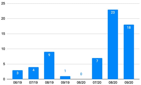 As can be seen in Figure 3, the events published on the dates set out in the study were a total of 65. There is a large difference between the months of June and September 2019 and the months of August and September 2020. The absence of events during the month of June is mainly due to the existence of the SARS-CoV-2 coronavirus pandemic. It is noteworthy that 61% of the total events held between 2019 and 2020 took place in August and September 2020. The Wine BC website recorded up to 41 events out of the total 65 recorded in those two months.