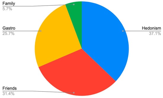 Figure 4 shows the distribution of events according to the type of classification. Only 5.7% correspond to events announced for the whole family, which can be related to alcohol consumption linked to wineries. On the other hand, dinners and gastronomic events in wineries account for 25.7% of the total. At more similar percentages, over 30%, we can find the events in which activities related to groups of friends are announced in the wineries and, as the main category, events related to hedonism. These events include, among others, days of yoga, chocolate, and wine among the vineyards as relaxation and enjoyment activities for visitors.