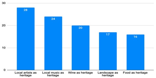 The presence of cultural heritage in its different facets is presented in Figure 5. In this sense, the total adds up to 105 elements, given that most of the 65 events can be classified in more than one category. The category that focuses on local music as part of the heritage stands out, with 28 events with this type of presence. In most of them, it is also linked to local artists. On the other hand, not all the events present wine as heritage, but in 20 of the 65 analyzed wine appears as a relevant element in the promotion of the event. On the other hand, the landscape of wine as a heritage element and food also appears on 17 and 16 occasions, respectively.