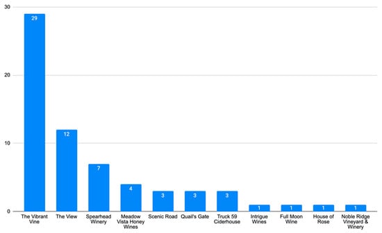 Finally, of the 65 events announced at Wine BC, The Vibrant Vine winery is the one that has made most use of the British Columbia Wine Institute’s website calendar, with 29 events, representing 44.6 % of the total. The View, with 12, is the next one, significantly far from The Vibrant. Next is Spearhead with seven, Meadow Vista Honey Wines with four events and Scenic Road, Quail’s Gate, and Truck 59 with three events each. Four of the 11 wineries analyzed only published one event (Figure 6).