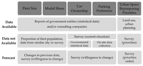 Data about car ownership and parking preference can be provided by government entities and municipals, mobility service providers (e.g., car-sharing operators), and consulting companies, too. As these data, especially parking preferences, are not usually available, a survey is suggested to gather detailed information, revealing the parking habits in the current situation is possible through on-site data collection. Comparing the available and used parking spaces is an appropriate indicator for expressing preference (demand–supply comparison). Herein, the calculations of the proportion between on-street and off-street parking, occupancy rate, and cost–benefit analysis are feasible.
