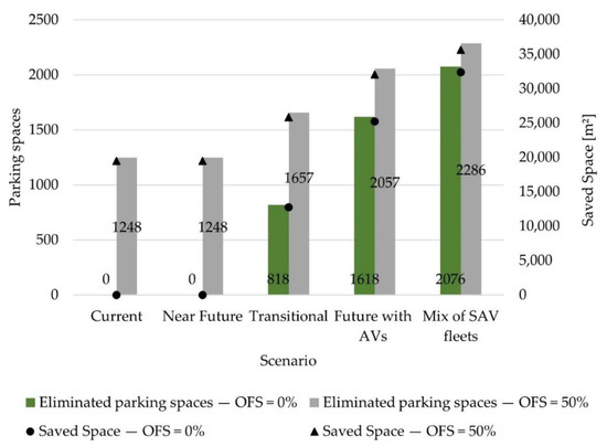 Increasing the adoption of AVs in shared systems may cause a reduction in the number of vehicles circulating on streets and, consequently, the demand for parking spaces. As a result, it allows changes in the current urban infrastructure, transforming parking spaces to alternative uses such as green spaces, additional traffic lanes, and spaces allocated to cyclists or pedestrians may be possible.