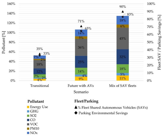 Besides the mentioned pollutants, comparing the lifecycles of SAVs and conventional vehicles, SAVs would reduce the energy use, the emission of greenhouse gas (GHG), nitrogen oxide (NOx), volatile organic compounds (VOC), and 10 μm particulate matter emissions (PM10), ranging from 5% to 50% [45]. As a result, business models that shift from private ownership to shared-use mobility services have the potential to reduce transportation GHGs [41]. Up to 60% reduction in GHG emissions and up to 94% in CO2 emissions are expected [46]. However, consumer choice represents a crucial element for environmental benefits generated by AVs use becoming reality. For instance, a survey in Germany revealed that private AVs will still be preferred in the future [47].