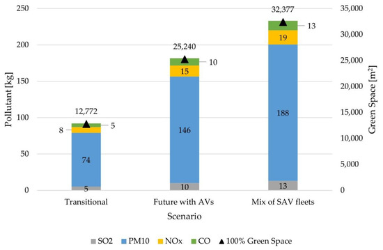 Not only the use of a parking space but also the phases for infrastructure construction and maintenance (materials extraction and transport) add carbon dioxide (CO2), sulphur dioxide (SO2), and particulate matter emissions [39,40]. With full-scale AV adoption, the footprint of parking may be reduced as AVs could double-park [41] and be smaller due to the average car occupancy below two [42]. These phenomena reduce the amount of space needed in parking areas. Decreasing the demand for parking and fleet size would considerably eliminate part of the emissions. Nevertheless, electric AVs are likely to minimise emissions and maximise the environmental benefits, but it depends on whether electricity comes from renewable energy sources [43] and the emission intensity of the grid is kept at a minimum [44].