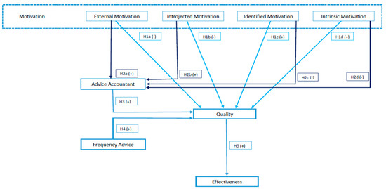 Furthermore, the objective second opinion of an expert such as an external accountant might be enlightening as they might identify items that need adjustment [19,35]. The development of a realistic and complete business plan requires a thorough and careful consideration of very diverse aspects of the business project. A competent external accountant can assist entrepreneurs in preparing their business plan and can minimize the likelihood that it will be inaccurate and/or incomplete [70]. They are able to fill knowledge gaps and to help entrepreneurs to process information and identify opportunities and threats [54,70,71]. However, in [31], the authors found that only 23% of entrepreneurs asked an external accountant for advice before starting their business, and only half used an external accountant after starting their business. In [72], the authors stated that entrepreneurs might undervalue these advisory services when they are not familiar with the use of external support [23]. Accountants are not merely “bean counters”, but are able to act as coaches or partners that provide tailor-made business advice [38,39,40,67]. Therefore, it is important that entrepreneurs are aware of the services that external accountants are able to provide, but it might be even more important for accountants to address their (potential) added value and highlight the positive impact their services will—or might—have in the future [42,73,74]. The motivational profile of entrepreneurs to develop a business plan is expected to impact their reliance on the advice of an external accountant. Some entrepreneurs will experience an external pressure to develop a business plan and are presumed to focus on complying with the technical aspects of a business plan. These control-oriented entrepreneurs will mainly rely on the advice of an external accountant to meet the legal requirements and/or expectations of third parties. Thus, entrepreneurs who are more control-oriented are expected to use the advice of an external accountant to develop a business plan. Therefore, we hypothesize the following: