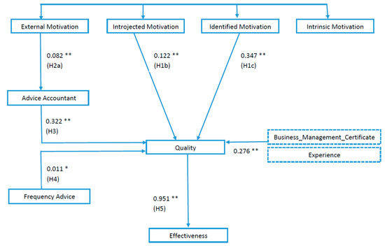 Finally, the regression analysis in model 4 confirmed Hypothesis 5, as the quality of the business plan was positively and significantly linked to effectiveness (p < 0.001). This finding suggests that a high-quality business plan enables entrepreneurs to use their business plan as an effective management instrument. In other words, a thorough reflection on the diverse subjects of a business plan seems to help entrepreneurs to monitor the evolution of the company effectively. In addition, we performed a robustness test using a path analysis in IBM SPSS Amos 22. In [108], the authors stated that “a good fit is reached when the chi-square is insignificant, the CMIN/DF is less than 3, the CFI is on or above 0.95 and when the RMSEA is less than 0.08” (p. 330). The model fit indices showed good values; the chi-square value was insignificant (35.486, p = 0.080 with 25 degrees of freedom). Furthermore, the CMIN/DF was 1.419, the CFI was 0.977, and the RMSEA was 0.039. Introjected and identified motivation were significantly and positively related to the quality of the business plan (p = 0.001 and p < 0.001, respectively). This result confirms the finding that entrepreneurs with a high introjected or high identified motivation tend to develop a high-quality business plan. The possession of a business management certificate was also positively and significantly related to the quality of a business plan (p < 0.001). Furthermore, externally motivated entrepreneurs tend to rely more on the advice of an external accountant (p < 0.001) as external motivation and the advice of an external accountant were positively and significantly related. In addition, the results affirm the positive relationship between the advice of an external accountant and the quality of the business plan (p < 0.001). Moreover, the positive relationship between the frequency of advice provided by an external accountant and the quality of the business plan was also confirmed (p = 0.023). Finally, the path analysis confirmed the significant and positive relationship between the quality of the business plan and effectiveness (p < 0.001).