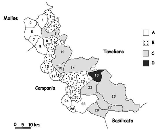 Monti Dauni: percentage change of inhabitants in the 1991–2019 period (our processing of ISTAT data). (A: > −35%; B: between −35% and −24.27%; C: between −24.27% and 0; D: positive percentage changes). (1: Casalnuovo Monterotaro; 2: Carlantino; 3: Casalvecchio di Puglia; 4: Castelnuovo della Daunia; 5: Celenza Valfortore; 6: Pietramontecorvino; 7: San Marco la Catola; 8: Motta Montecorvino; 9: Volturara Appula; 10: Volturino; 11: Alberona; 12: Biccari; 13: Roseto Valfortore; 14: Troia; 15: Castelluccio Valmaggiore; 16: Celle di San Vito; 17: Faeto; 18: Castelluccio dei Sauri; 19: Orsara di Puglia; 20: Bovino; 21: Panni; 22: Deliceto; 23: Ascoli Satriano; 24: Monteleone di Puglia; 25: Accadia; 26: Sant’Agata di Puglia; 27: Candela; 28: Anzano di Puglia; 29: Rocchetta Sant’Antonio).