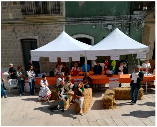Participating to the final day of the event “Comunità del cibo buono e autentico”, the municipality showed the great importance it attaches to the enhancement not only of the tangible heritage (environmental and cultural resources), but of intangible legacy as well, by organizing several historical and anthropological events (folk dances and songs, ancient street games, and historical parades), a necessary contribution for spreading the culture and knowledge of the territorial traditions seen as an essential instrument to develop the tourist image and economy [52]. Further, it organized food markets and stands and proposed tasting of typical products and dishes (cereals, vegetables, grapes, olives, orecchiette and fusilli, cacio, caciocavallo and cacioricotta, sfogliata with onions, and pettole) to promote the territorial discovery through the excellent and typical products that make it unique. Through the initiatives put in place by the municipal administration in cooperation with the inhabitants, the associations and the local producers, visitors were able to live and share the past and present spirit of the place, becoming familiar with the territory. At their arrival, after purchasing the daily voucher (EUR 12) to get their breakfast and lunch, tourists were welcomed in Piazzetta Piscero by the “street band” and by some young women in folk costumes who, while dancing and singing, offered them the “farmer’s breakfast” made of fried bread with sugar or wine, cooked at the time, thus allowing a direct contact with cooking traditions through the five senses. The “temporary citizens” could revive some important moments of the ancient community life, such as the grape crushing by feet or the clothes washing in the public washhouse called “il Piscero” where, according to the tradition, by drinking water the “stranger” becomes castelluccese. Then, it began the village guided visit with the Mayor and BAI tutor of Castelluccio, Maria Manuela Circelli. It included a visit to the traditional mill, still operating, a symbol of the relations among food, territory, and cultural identity; a view of the landscape from the belvedere Figure 2; and a visit of the museum, opened on 3 August 2018 and focus on the “Sistema museale della Valle del Celone”, as well as the Main Church and the Byzantine tower, the oldest evidence of Castelluccio Valmaggiore. After participating in a hand-made pasta workshop and listening to a poetry reading in the local dialect, the lunch began. It took place in the centre of the village, in front of the Main Church Figure 3 and it was a significant moment of conviviality, a time for socializing and sharing among residents and travellers, a re-enactment of ancient meals in friendship and happiness, an example of authentic relationships and genuine dishes (sausages, bean soup, "Spezzatielle", that is local lamb with chicory, eggs and pecorino cheese, and local wine).