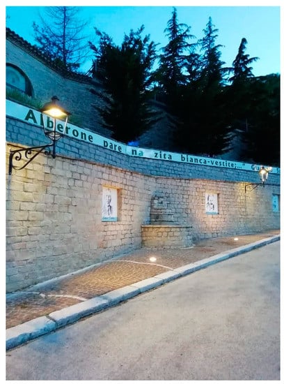 The municipal administration was indeed commendable for their ability to intercept several forms of public financing (Province, Region, EU) to promote the upgrade of the road network, the recovery of the hydrogeological instability, the enhancement and protection of the environmental and anthropic resources. Particularly noteworthy are the works, still in progress, for the upgrade and recovery of the hydrogeological instability in the sports field area, funded by the ERDF/ESF ROP Puglia 2014–2020 (axis V, action 5.1), supplemented by the project for the extension of the existing sport facilities and the creation of a nature trail; the interventions for the restoration and upgrading of seven fountains (Fontana Muta see Figure 5, Fontanella, Pisciarelli, Fontanino di piazza Civetta, Fontana del Pozzo, Fontana di via Belvedere, Fontana del Monumento ai Caduti), that will create a walking path and cycleway within the village, also known as “town of water” or “one hundred fountains village”; lastly, the repair of the pavement of some areas of the historical centre by regional funds. Huge interventions, carried out through different financing, also concerned the road network, thanks to which it was possible to fully recover the external connection roads of the village as well as many of its internal roads, with a positive impact on the accessibility and availability of the places by whoever wishes to live in them or reach them; the works for the improvement of public lightning, thank to which it was possible not only to install LED lamps on the whole municipal territory, but also LED spotlights to enlighten the main public and cultural buildings for the benefit of residents and tourists; the installation of the required signs, previously missing, to reach, from the village, the nature trail “U canale di tegghje” (channel of the baking pans. The name derives from the peculiar shape of the small falls created by water and stones) through which it is possible to reach the wood, the river and the small falls created by water and stones along its stream and that give the name to the place. Among the financing proposals submitted but still pending, the following are to be mentioned: (1) the project for an underground museum network, to be managed by a community cooperative composed of Alberona young people, for which an allocation of EUR 1,000,000 was applied for to the MiBACT; (2) the project for the construction of a panoramic cableway to connect the village to the top of the Monte Crocione-Pagliarone, for which an allocation of EUR 14 million has been applied for to the central Government, to be complemented by nature trails and rest areas, a bicycle parking station and the recovery of sheep tracks [59,60].