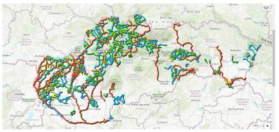 The network of cycle routes in Slovakia is shown in Figure 1. In terms of their importance, transnational (EuroVelo) routes and long-distance routes marked in red have the greatest contribution to daily commuting. Not to be overlooked are the blue cycle routes, which mark parallel routes to EuroVelo routes and long-distance cycle routes. The densest and most diverse network of cycling infrastructure in Slovakia is developed in the western and northern part of the territory, which can be considered positive with regard to the population density of this area and the unfavorable traffic situation, which is worst in the capital and its surroundings. Bratislava and its surroundings can be considered the most congested area of Slovakia, which is characterized by the fact that even short distances to work are time consuming compared to the area where a commuter can cover a greater distance in less time. There are currently 98 km of red cycle paths and 148 km of blue cycle paths built in Bratislava. The less favorable condition of the cycling infrastructure is in the eastern and southern part of Slovakia, where the network of cycling routes is much less dense compared to the economically more developed west.