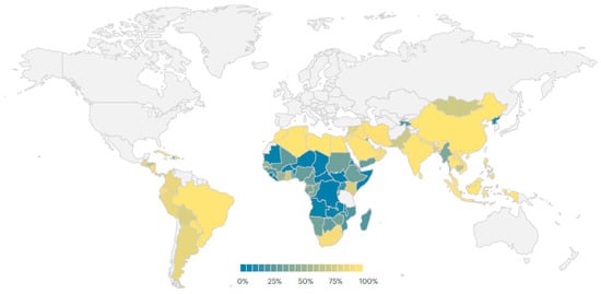 The 17 Sustainable Development Goals (SDGs), agreed by the United Nations Conference at the Paris 2015 meeting, mark the international commitments to eradicate poverty and improve people’s quality of life [1]. Objective number seven, SDG 7, determines that by 2030 all the planet inhabitants should have clean, modern, and safe energy services. Energy is essential to improve the quality of life of the population, generate synergies, and promote social, economic, health, education, and environmental achievements [2,3,4,5]. However, having a connection to the electricity grid does not automatically imply access to quality, reliable, safe and economical energy in line with the achievement of SDG 7. Ayaburi et al. (2020) estimated that 3.5 billion people have an electrical connection but suffer frequent and long-term interruptions, which would qualify the electrical service as unreliable and of low quality [6]. In practice, this population does not meet the conditions required by SDG 7. In this sense, ensuring access to energy implies more than a physical connection to an energy source, it also implies a quality supply. In particular, the lack of access to electric power in 2019 affected 10% of the world population (771 million people) [7] who have affected their development possibilities [8]. The majority of this population is located in rural areas, especially in sub-Saharan Africa (578 million people without access to electricity), India, regions of Asia, and to a lesser extent, the Middle East and North Africa (see Figure 1). For the Latin America and the Caribbean (LAC) region, the electricity coverage has increased to 98.31%, considering it one of the regions with the highest electrical coverage on the planet. However, there are still 11 million people without access to electricity in this region [9].