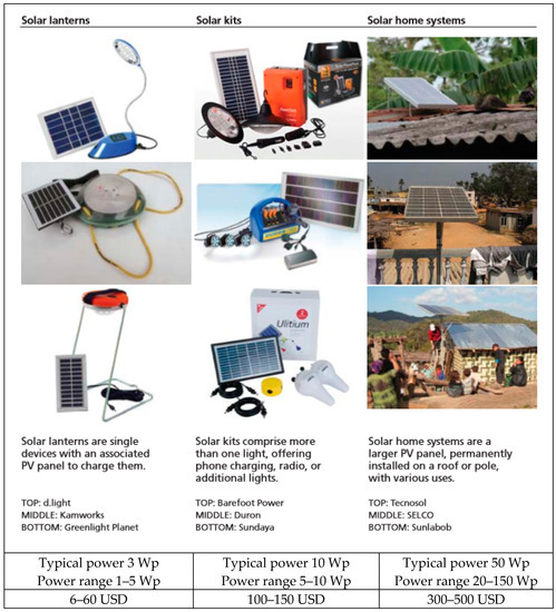 In a fast process of evolution, the manufacturers of pico PV equipment incorporated in their designs new elements, such as Light-Emitting Diode (LED) lamps, microelectronics for control, rechargeable NiMh batteries, lithium-ion, lithium iron phosphate (coexisting with lead-acid batteries), showing a broad and diversified offer [64] and installation in rural areas of the world [65]. The International Finance Corporation (IFC) already shows a classification of three groups of equipment [66]: Rechargeable solar lanterns, solar kits, and the classic SHSs (see Figure 3).