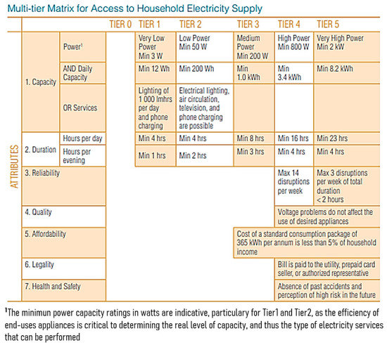 Access tiers. Matrix for measuring the access to household electricity [72].