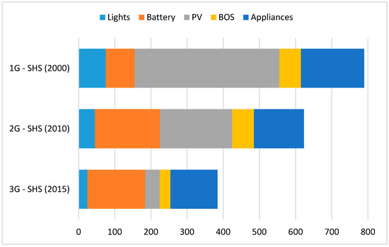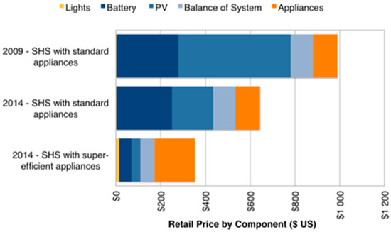 Once more efficient technologies were defined as a need, the same benefits of 2G-SHSs could be covered with 90 Wh/day (using a 3 W LED lamp, 11 W flat-screen TV with a built-in DVD player, and 3 W USB cell phone charger). In 2015, a study by the Lawrence Berkeley National Laboratory showed that it was possible to cover the demand of a conventional SHS (600 lumens of illumination for 4 h/day, 19-inch TV 4 h/day, small radio 6 h/day, charge one cell phone per day) with a super-efficient SHS of only 25 Wp [94], with the consequent reduction in costs, as shown in Figure 8.