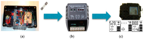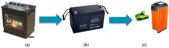 Changes in batteries for energy storage in SHSs [100]. (a) 1G-SHSs: Lead-acid automotive battery, (b) 2G-SHSs: Lead-acid solar battery, (c) 3G-SHSs: Lithium battery (Phocos, Germany).