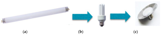 Changes in lighting technologies used in SHS [100]. (a) 1G-SHSs: Fluorescent tubes of 18 W; (b) 2G-SHSs: CFL lamps (8 to 15 W); (c) 3G-SHSs: Light-emitting diode (LED) lamps (3 to 5 W).