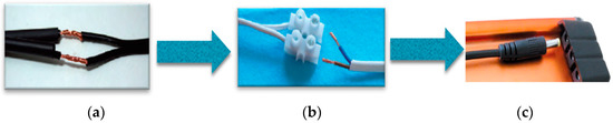 The evolution of electric connections is possible to see in Figure 14. The electrical connections of 1G-SHSs were normally made through splices in the conductors that had to be isolated later (the Bolivian standard NB1056 included an annex on the best way to make splices). For 2G-SHSs, generic connectors are incorporated as a standard of installations, eliminating splices and insulating tape, thus reducing the points of failure. On the contrary, 3G-SHSs use connectors specifically designed under a plug and play logic. Thus, it is easy to interconnect modules, loads, batteries, using universal ports. This makes 3G-SHSs installations much faster and extremely safe, avoiding errors, and making self-installation possible without a specialized technician.